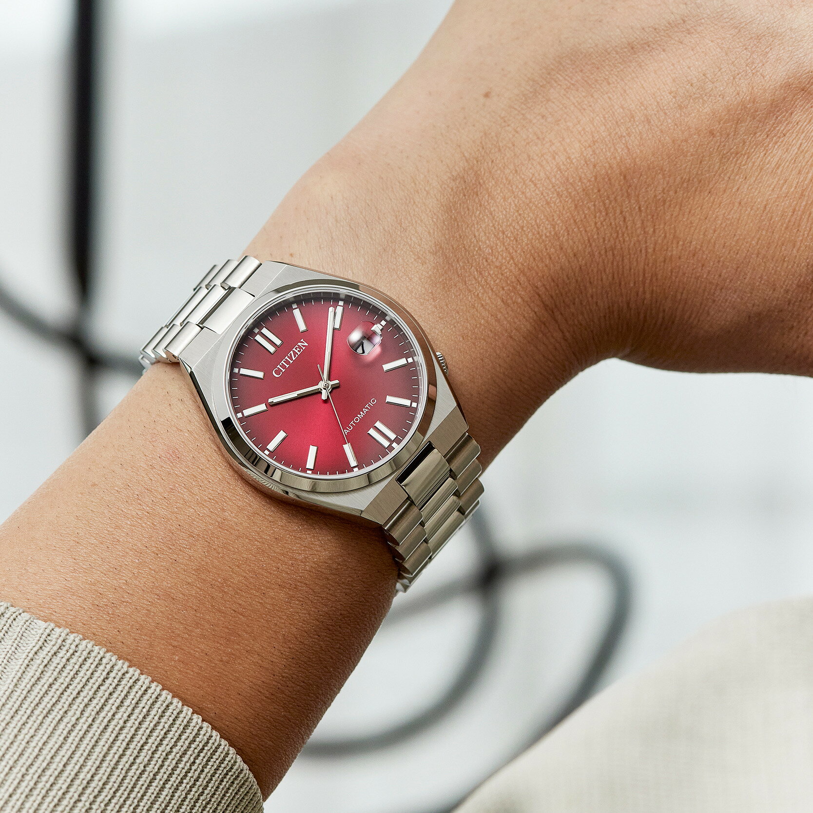 【CITIZEN TSUYOSA collection】人気のTSUYOSAからシックな深みのあるバーガンディカラーが登場!シンプルでベーシックな針とインデックス、文字板の色が映える魅力のあるデザインの機械式時計です。シースルーバックの裏ぶたで、機械式時計ならではのメカの動きを楽しめます。