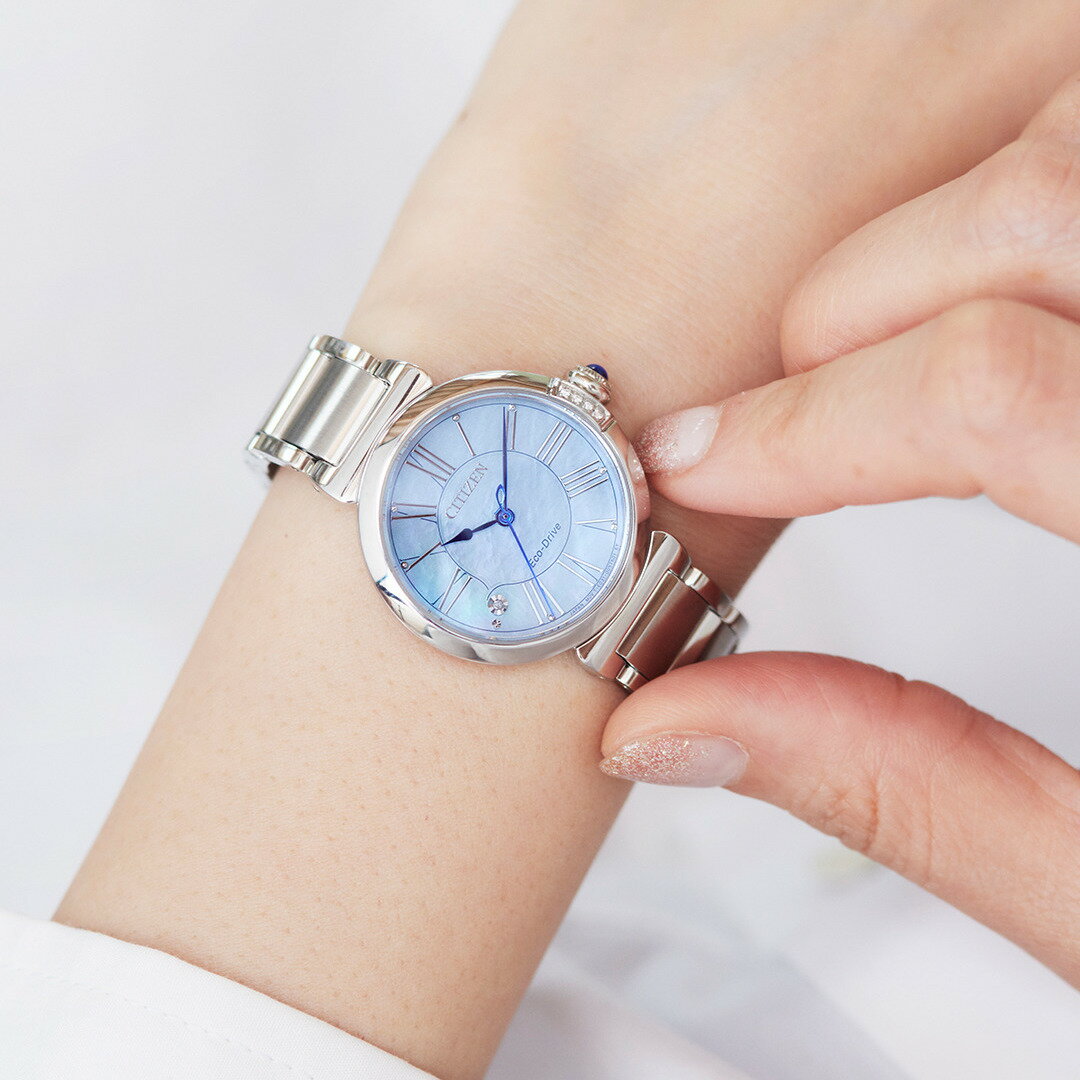 【CITIZEN L】毎日にさりげなく、 ジュエリーの華やぎを。文字板には、スズランをつたう雫のような パーツとひときわ輝くダイヤモンド。 ケースにも4つのダイヤモンドをあしらい、 爽やかなブルーのりゅうずを際立たせて、腕元を見るたびに可憐な、スズランの花を手にした時の幸せな気持ちを呼び起こしてくれるモデルです。