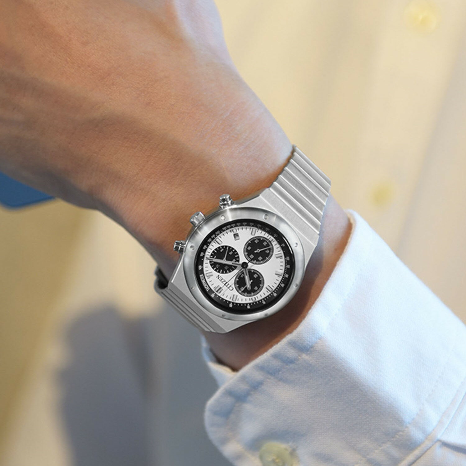【CITIZEN RECORD LABEL】1984 chronograph 1984年に発売された多機能アナログクオーツクロノグラフ「スポルテ MS」をアップデート。金属素材の白文字板をベースに、レトロな中にもモダンな雰囲気を感じられるケースと組み合わせました。