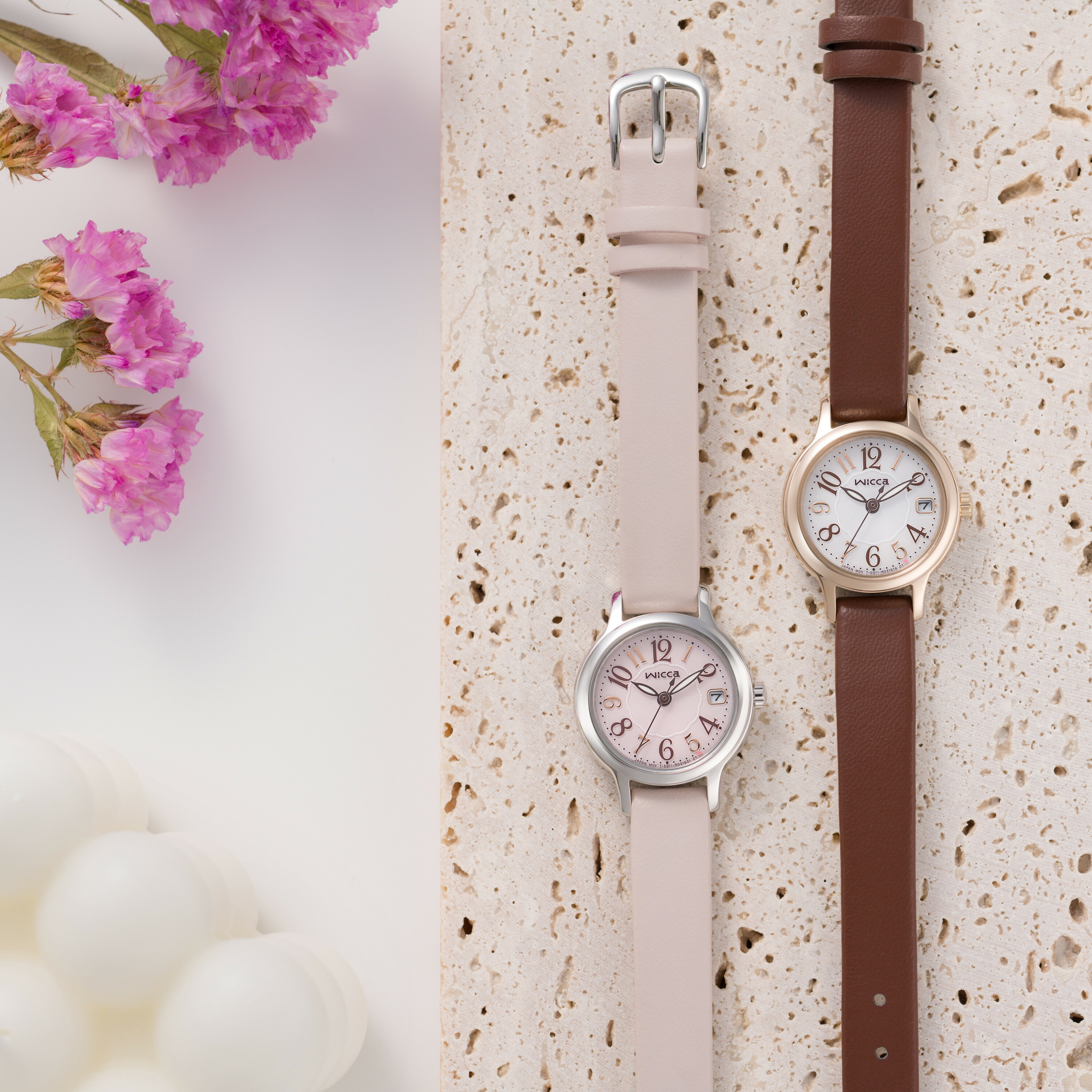 【CITIZEN wicca】可愛らしく大きめのアラビア数字は視認性バツグン。どんな服にも合わせやすいベーシックなブラウンカラーのバンドは、ペットボトルのリサイクル素材「エコペット」を使用し、環境にも優しい腕時計です。