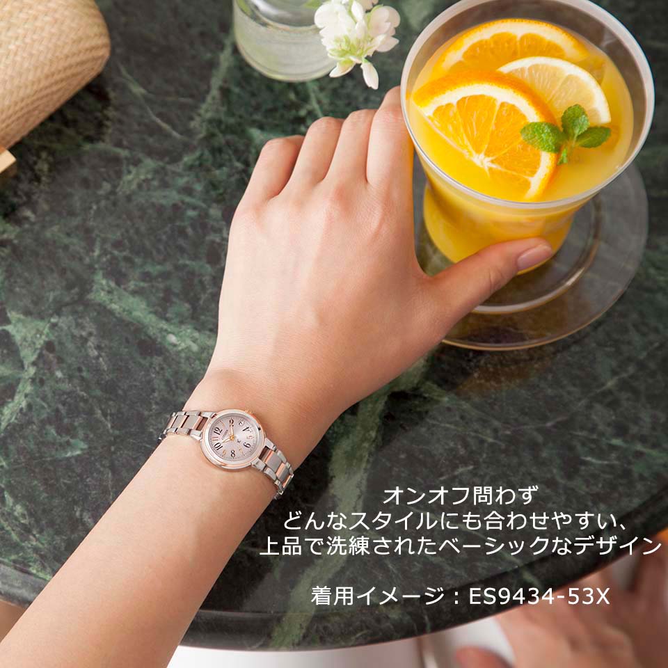 【CITIZEN xC】雫のようにつややかでころんとしたフォルムが上品で可愛らしい印象のモデルです。ケース径は、21.5mmの小さめサイズ。繊細なトーンの文字板には、雫をイメージしたカットパーツをセッティング。やわらかく軽やかなデザインのインデックスが手元を美しく彩ります。ご自身でバンドの長さ調節が可能なシンプルアジャスト仕様ですので、ギフトにもオススメです。