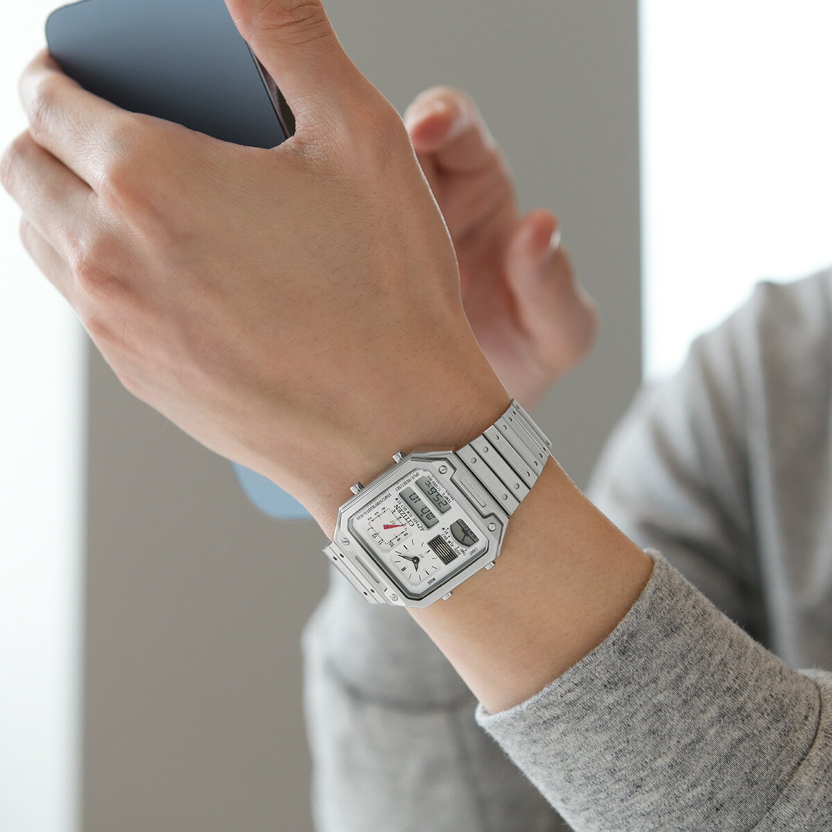 【CITIZEN THERMO SENSOR】1982年、温度センサー搭載のコンビネーションウオッチとして登場して多くのファンに愛されたサーモセンサー。現代版として登場!別体ベゼルやバンドの飾り穴が、コンビネーションクオーツのレトロな表情を強調し、武骨でありながらも洗練されたデザインの1本です。