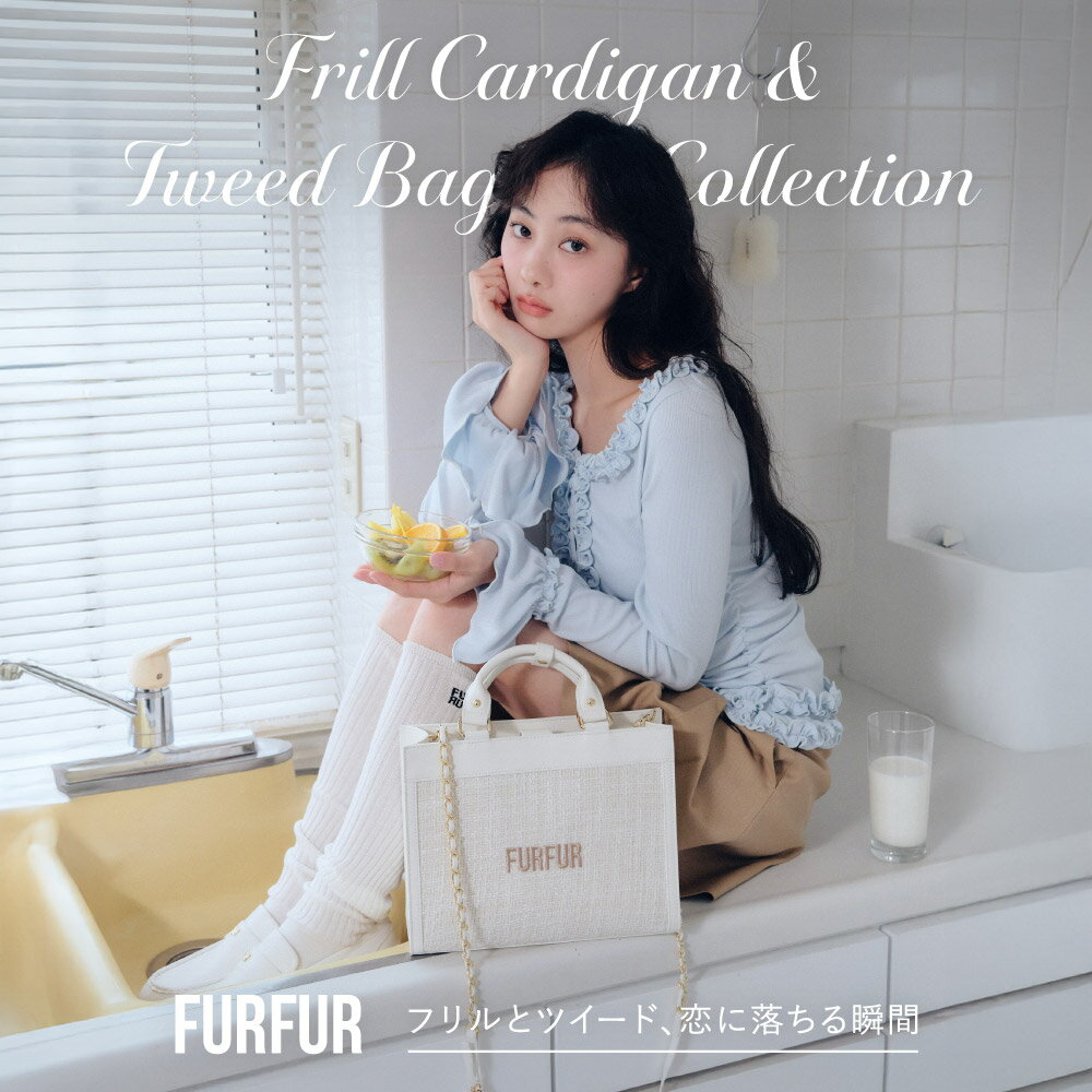 【FURFUR】FRILL CARDIGAN & TWEED BAG COLLECTION フリルとツイード、恋に落ちる瞬間 甘さを宿すフリルカーディガンと 気品漂うツイードバッグ。 羽織るだけで、持つだけで、 それぞれの魅力が引き立つ 春のマストコーディネートが完成。