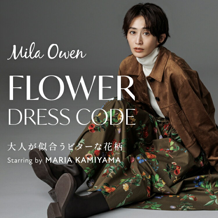 【Mila Owen】FLOWER DRESS CODE 大人が似合うビターな花柄 Starring by MARIA KAMIYAMA。春の訪れを予感させる、ロマンティックなフラワープリント。高揚感を写し取ったようなアートフルな花々は、あえて引き算的な着こなしをすることで、都会的なムードへと誘導してくれます。
