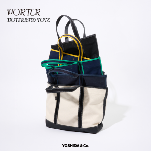 「PORTER BOYFRIEND TOTE」は、本体とハンドルのカラーコンビネーションがアイコニックなアイテムです。 メイン素材には、リラックスした雰囲気のある、目の粗いコットンキャンバスを採用しました。 内装のポケットはメッシュ素材で視認性が良く、整然と荷物を収納できる構造です。 ぜひ、豊富なカラーバリエーションの中から、お気に入りの一本を見つけてください。