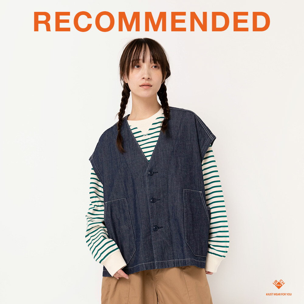 【URCH RNA】フレンチワークなデザインが映えるデニムベスト。ボリュームインナーとも相性が良く、着こなしの幅が広がるアイテムです。
