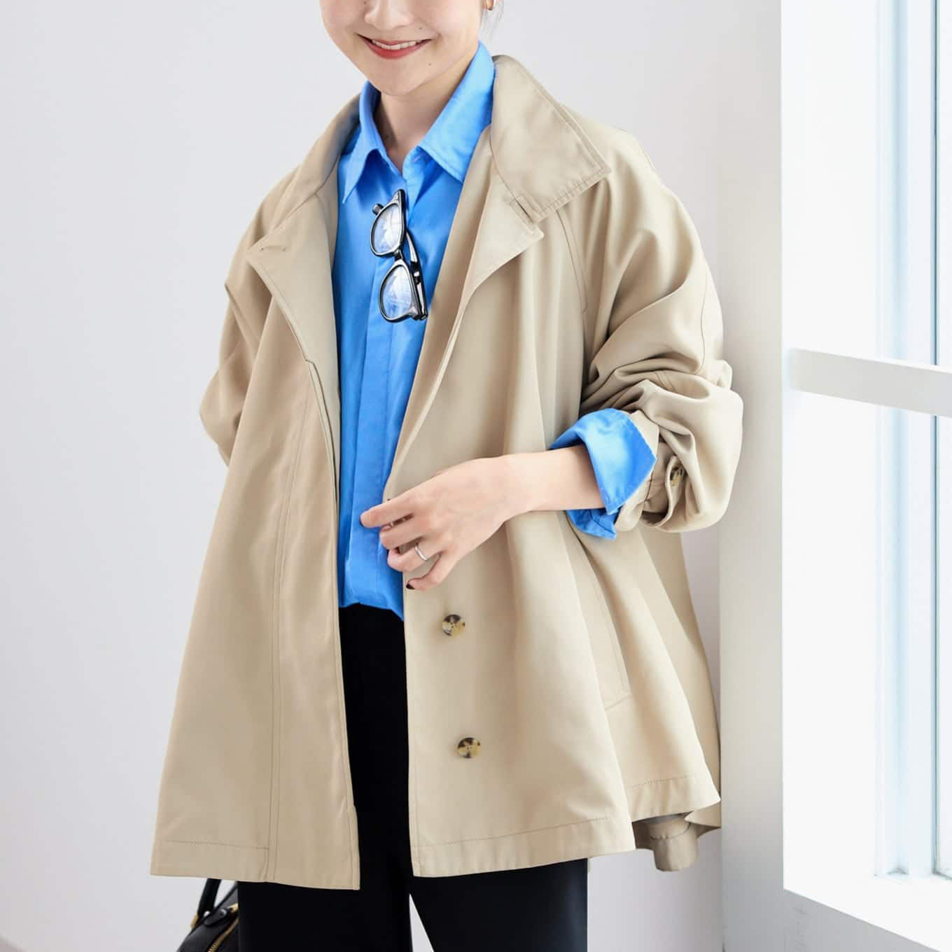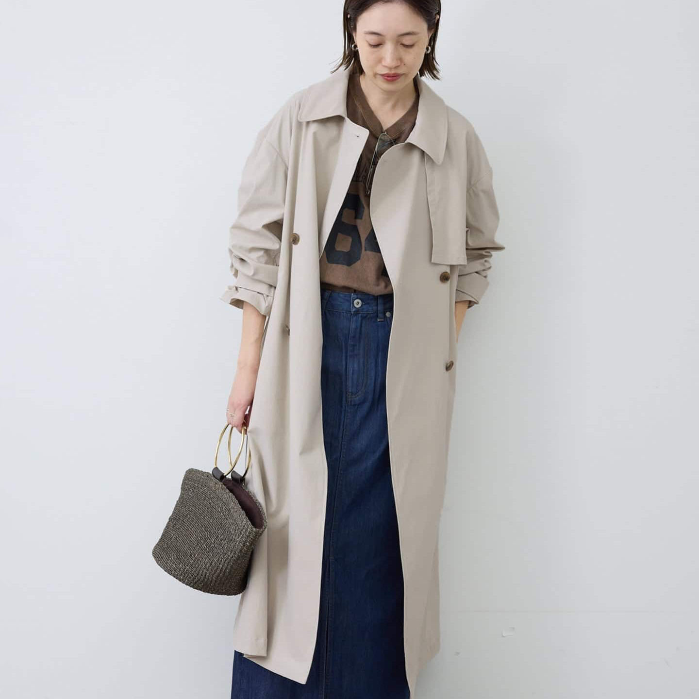 羽織るだけで大人の抜け感を演出するような オーバーサイズのトレンチコート。ほかにない春らしい明るいニュアンスカラーも魅力です*