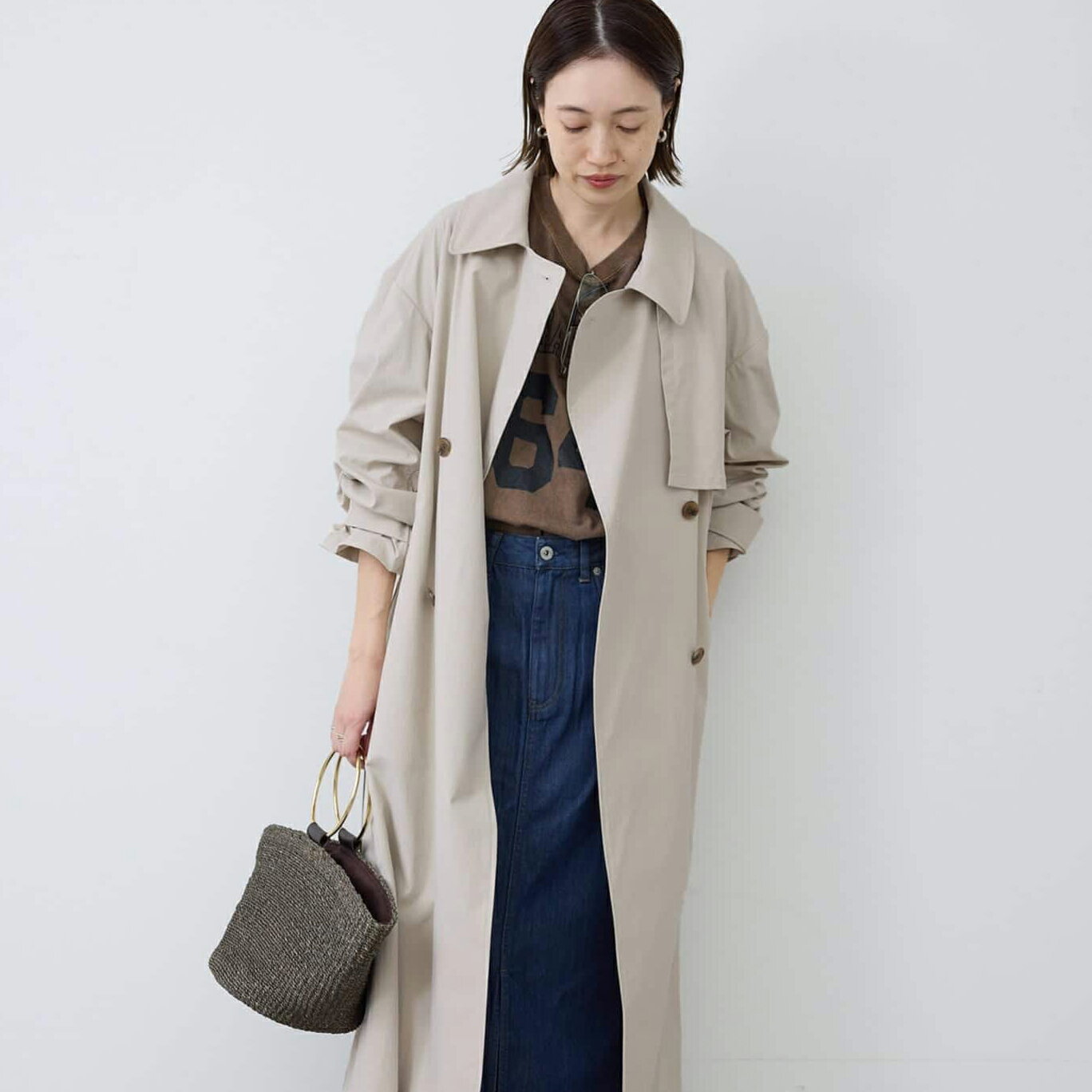 大人の抜け感を演出するような オーバーサイズのトレンチコート。春らしい明るいニュアンスカラーの2色がほかになく、中に着込みやすいゆとりのあるサイズ感にすることで春に大活躍の1枚に!