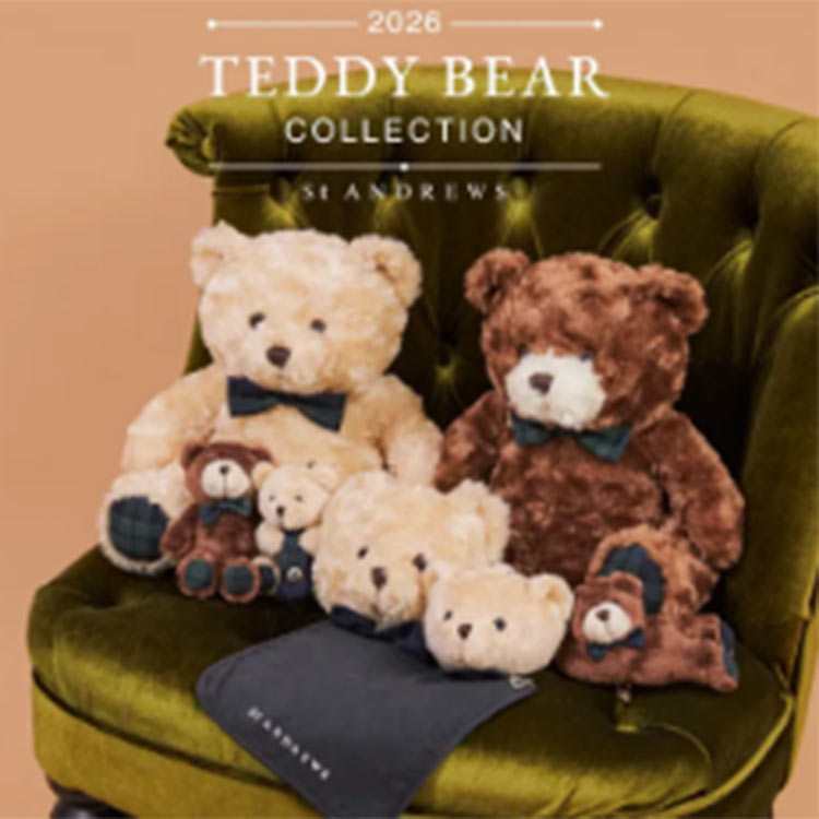 ブランドのアイコニックキャラクターとして愛され続ける、テディベア「アンドリュー」の新シリーズが登場。 2026 年モデルは、ベージュとブラウンの2 色展開。 スコットランド発祥のタータンチェックリボンが、上品さとキュートさを演出する。 バリエーション豊富なラインナップで、ゴルフシーンをより楽しく華やかに彩る。