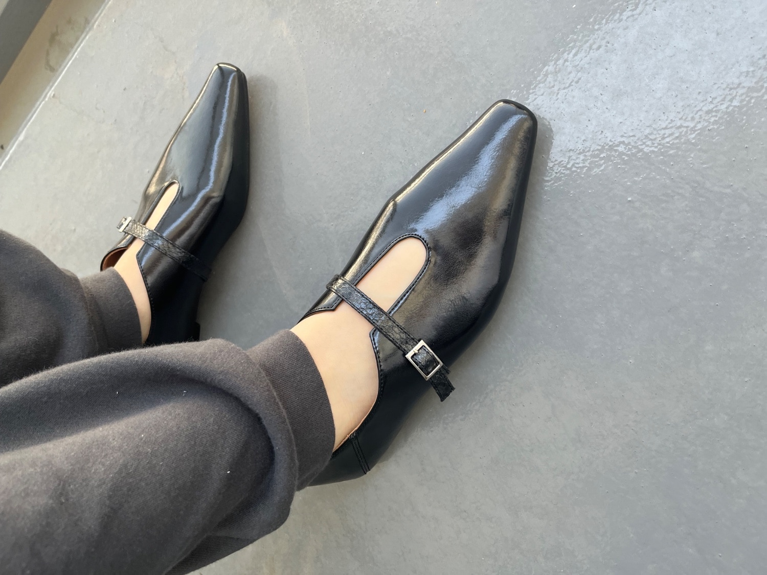 ブラック購入。 21.5cmですが、冬場厚手のタイツ履きたいので22cmを選びました。 ちなみに足は幅狭、甲低です。 ストラップのおかげかストッキングでも厚手のタイツでもパカパカ脱げる感じはなく快適です! ブラックはエナメルよりは鈍い光り方ですが、思ってたよりは光ります(笑 ワイドパンツから先端チラ見せするとアクセントになりお気に入りになりました