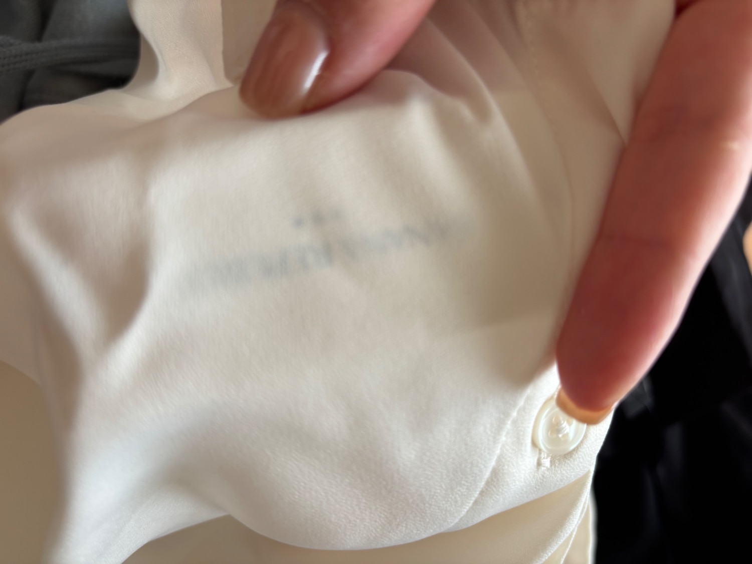 アイボリー寄りの色味で透け感あります。生地の質感がとても良く、肌触り完璧です。さすがバナナと思っていたら、小さい斑点の汚れがあり、ショックでした。ボタンで隠れる位置だったのでそのまま着ますが、むむむっとなりました。サイズは普段9-11号、M-Lを選ぶことが多い大胸ですが、Mで程よいゆとりがあり胸も目立たず、着痩せして見えました。ブラックはSを購入して、ぴったり気味で着ます。
