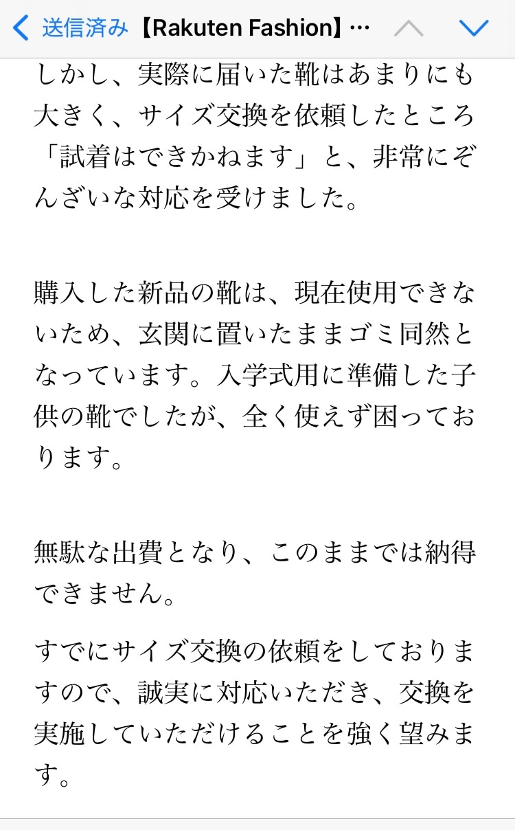 サイズが大きいため、靴は「サイズ交換が送料無料で可能」と記載があったことから購入いたしました。しかし、実際に届いた靴はあまりにも大きく、サイズ交換を依頼したところ「試着はできかねます」と、非常にぞんざいな対応を受けました。購入した新品の靴は、現在使用できないため、玄関に置いたままゴミ同然となっています。入学式用に準備した子供の靴でしたが、全く使えず困っております。無駄な出費となり、このままでは納得できません。すでにサイズ交換の依頼をしておりますので、誠実に対応いただき、交換を実施していただけることを強く望みます。21センチを購入→20センチへサイズ交換依頼済み。迅速丁寧スムーズに対応していただけたらと思います。商品は、可愛く問題ありません。子供の入園式用に早めに準備した靴でしたが、非常に残念です。 件名:有料交換の件について確認とご指摘 今回「有料交換」とのご案内をいただきましたが、こちらの負担額や手順についての説明が一切ありません。「交換でお受けします」と一方的に決められるのは困ります。詳細を明確にご説明ください。その内容を確認した上で、対応を検討いたします。また、初めから「送料無料ではない」という情報が提示されていなかった点についても納得できません。大変不親切な対応だと感じております。何度もやり取りを重ねているにもかかわらず、要点が不明確なままで、時間と手間ばかりかかっております。楽天ファッションの対応について、口コミであまり良くないという声を見かけていましたが、今回の件で実際にその通りだと感じ、非常に残念です。早急なご説明をお願いいたします。注文日9/10現在10/13(月)…他の衣類を扱うショップさんなら3日以内には対応してくれて送料無料で交換の取引になっている内容だが…。不思議で仕方ない。 お金を払ってゴミになりそうな予感しかないですね。
