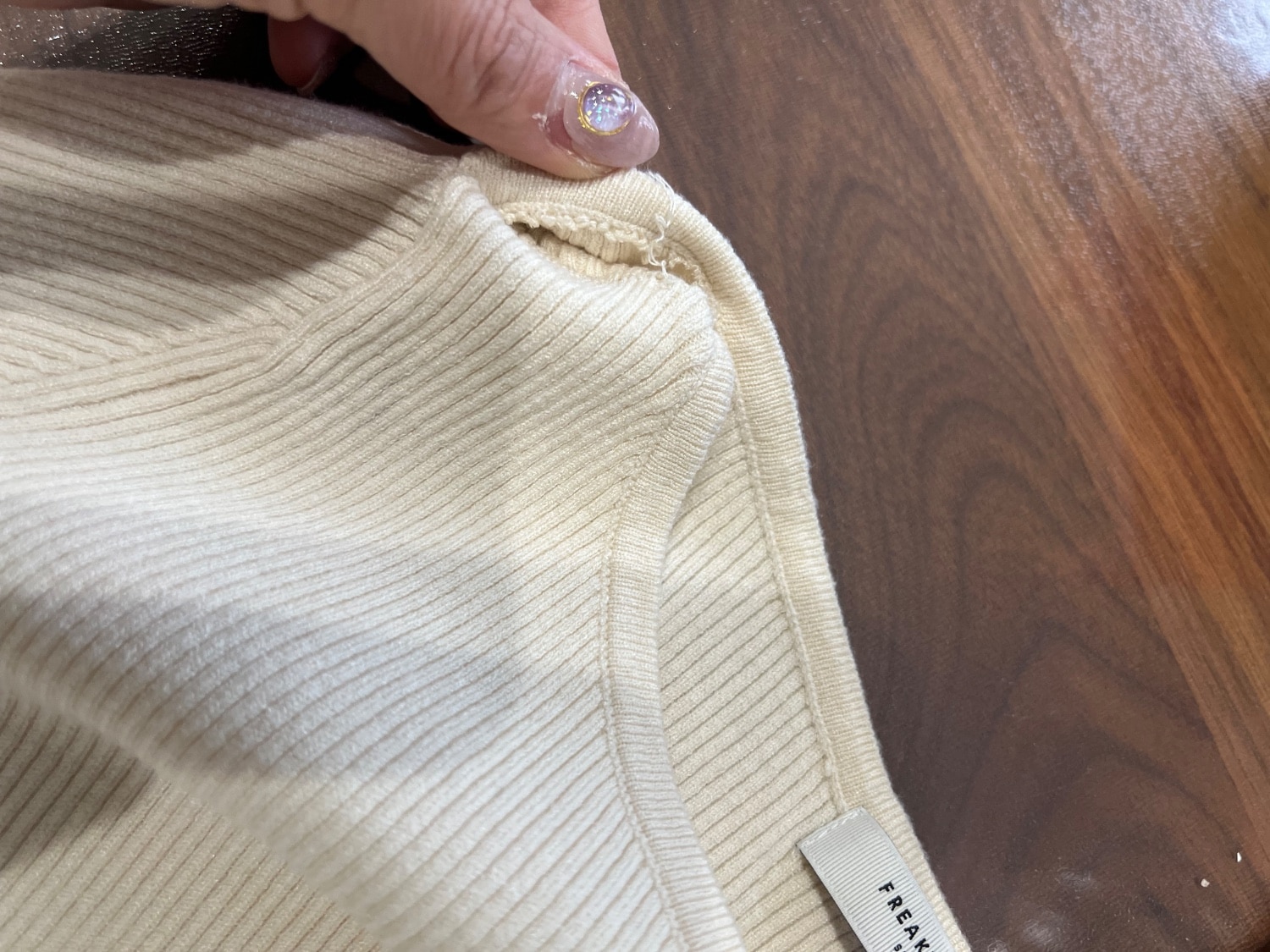 肩周りの作りは縫ってる糸が取れる前提の作りなのでしょうか…?と思ったのですが、縫い目の穴がしっかりあるのでそういう訳でも無さそうです。 まだ届いて3日目で今日初めて着ようと思ったら簡単に取れてしまいました。右側の肩はしっかり縫い付けられています。 色違いでもう1着買っておりそちらを先に着たのですが、半日ほど着用しただけですでに毛玉のようなものが出来始めていました。 骨スト159cm53kg。フリーサイズですが作りは少し小さめです
