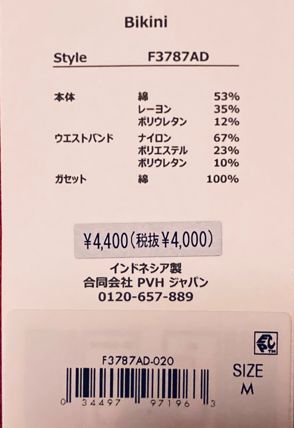 | 素材 | 本体:コットン53% レーヨン35% ポリウレタン12% ウエストバンド:ナイロン67% ポリエステル23% ポリウレタン10% クロッチ裏地:コットン100% |