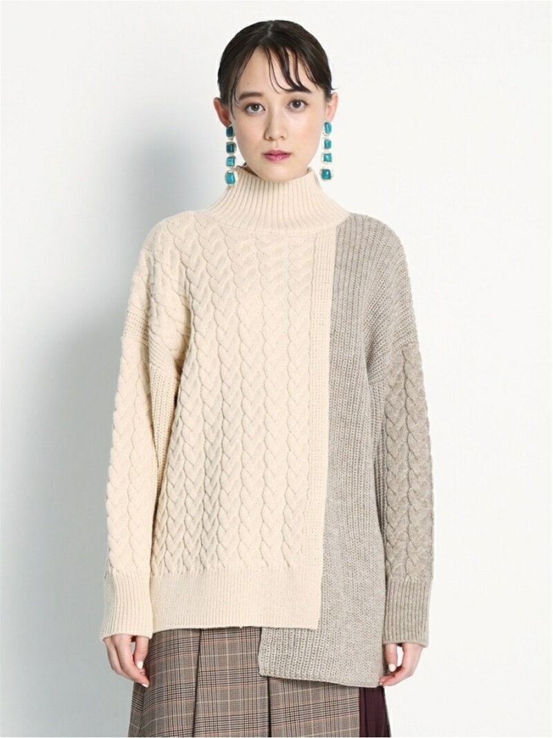 こちらのアイテムは、ケーブル編み×リブ編みを組み合わせたモード感のあるデザインが特徴的で、1枚でもおしゃれ感度の高い着こなしにキマる。ほっこり見えがちなケーブル編みニットは、切り替えデザインで変化をつけてみて。