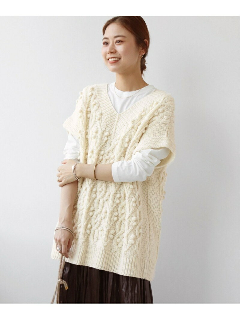 中でも今回ご紹介したいアイテムは、表情豊かなアラン編み、ハミルトンラムズウールを使用した柔らかな肌触り、着疲れしない軽さと温かな着心地が魅力のこちらの商品。縦ラインを強調したデザインなので、スッキリと大人っぽく着こなすことができます。重ね着するときは、インナーを裾から覗かせることもお忘れなく。