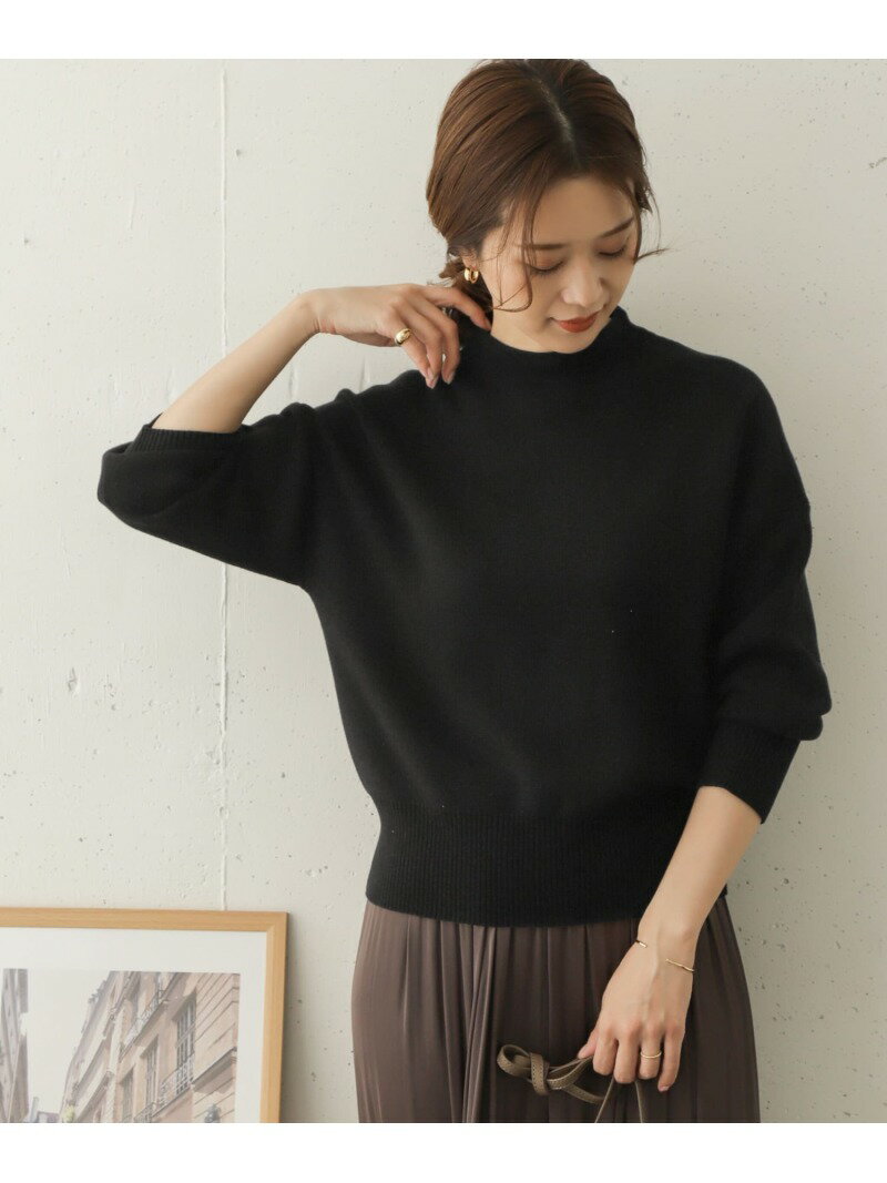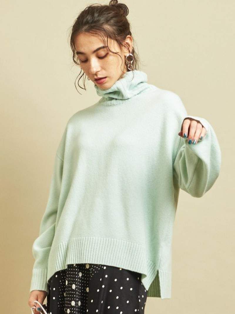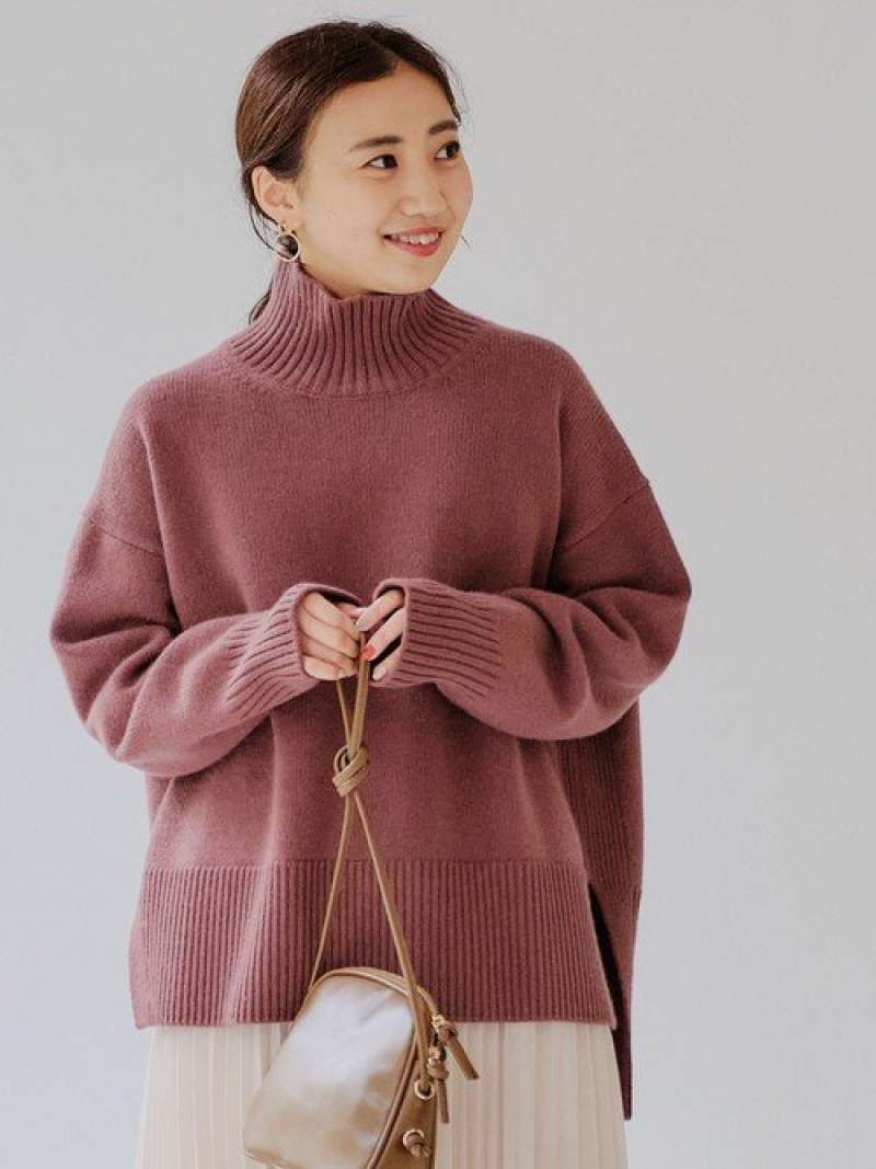 首の部分が瓶口のように首に沿って立ち上がったカタチをしているボトルネックのニットは、ハイネックよりも顔まわりをスッキリ見せてくれる。