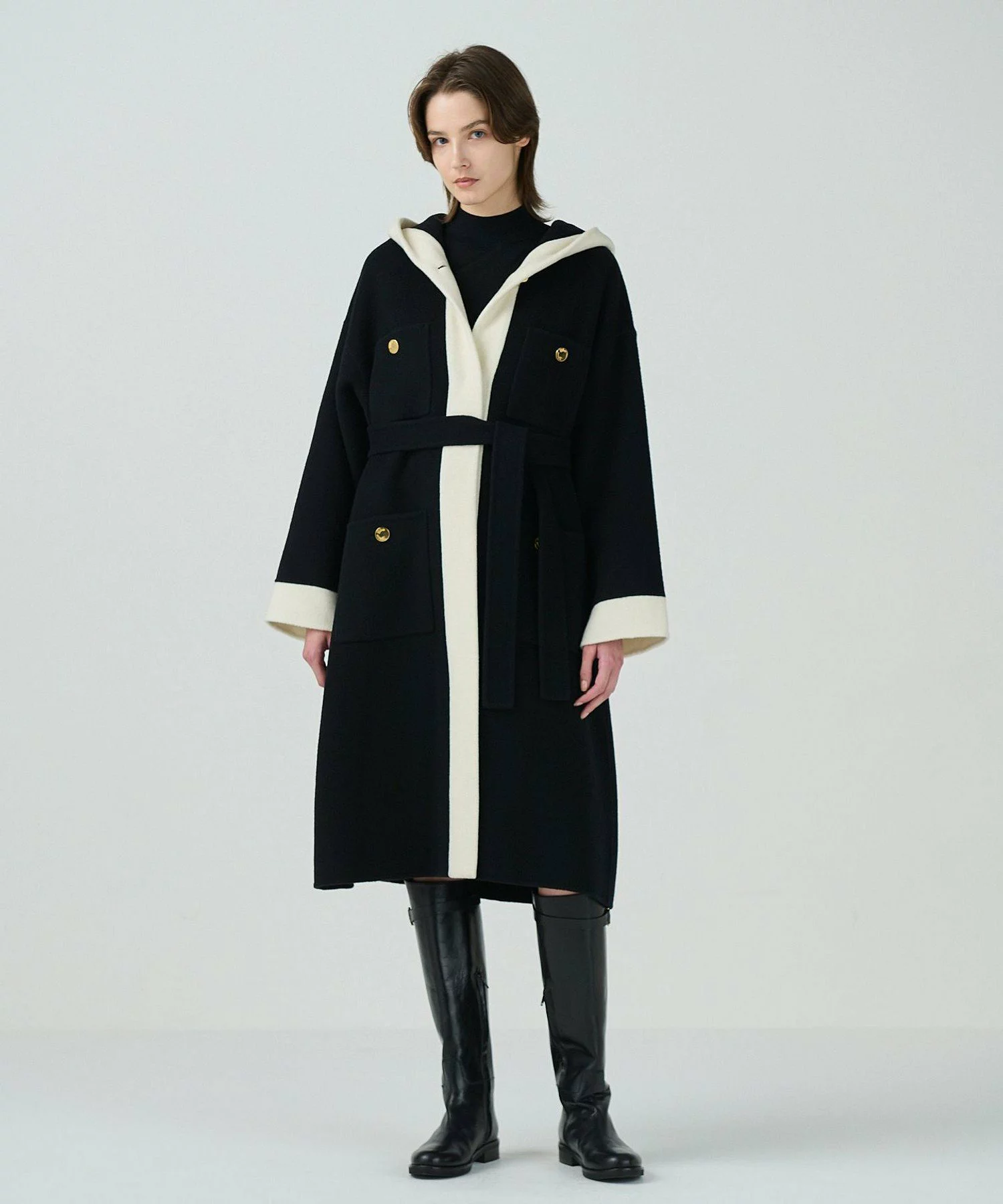 毎シーズン、人気を誇る〈グレースコンチネンタル〉のリバーコートを今季らしくアップデート。上質なラムウールを採用し、二重にした前立て部分をモダンなバイカラーに。近場なら手ぶらで外出できそうな大きいポケットや、頭をすっぽりと覆うフーディが施され、リラックスした気分でまとえる。