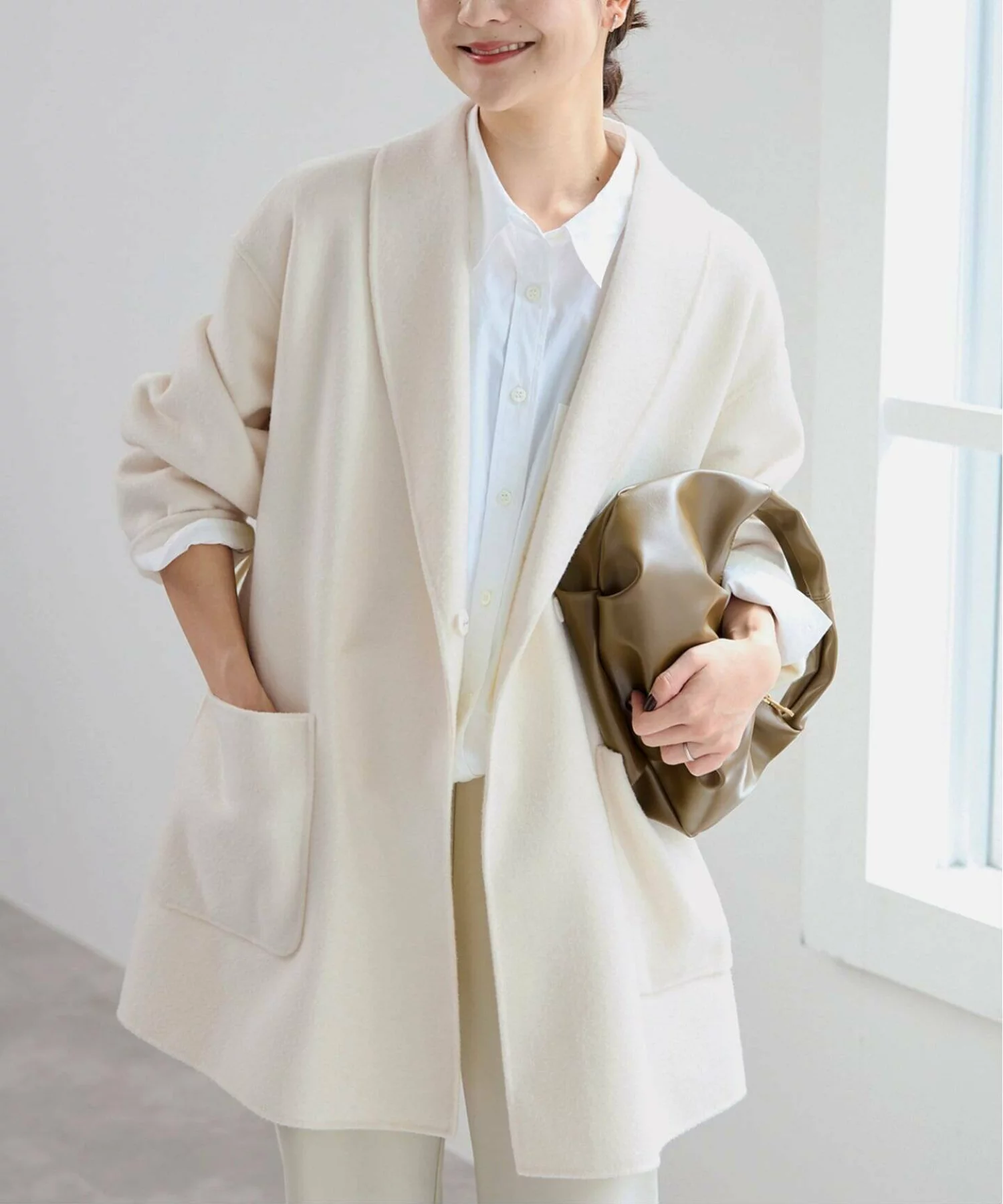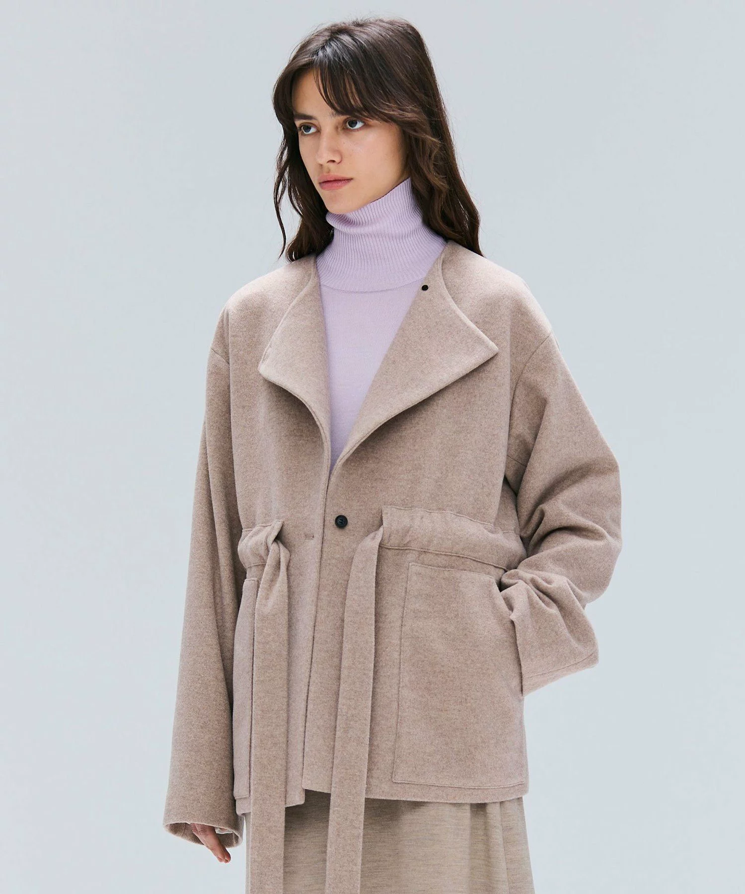 〈ベイジ,〉のコートは、フロントボタンの留め位置や、ウエストのドローストリング次第で、着こなしのムードを変えられる汎用性の高さが魅力。スタイリングを選ばずに羽織れるショート丈で、気になるヒップをさりげなくカバーしてくれるのも高ポイント。