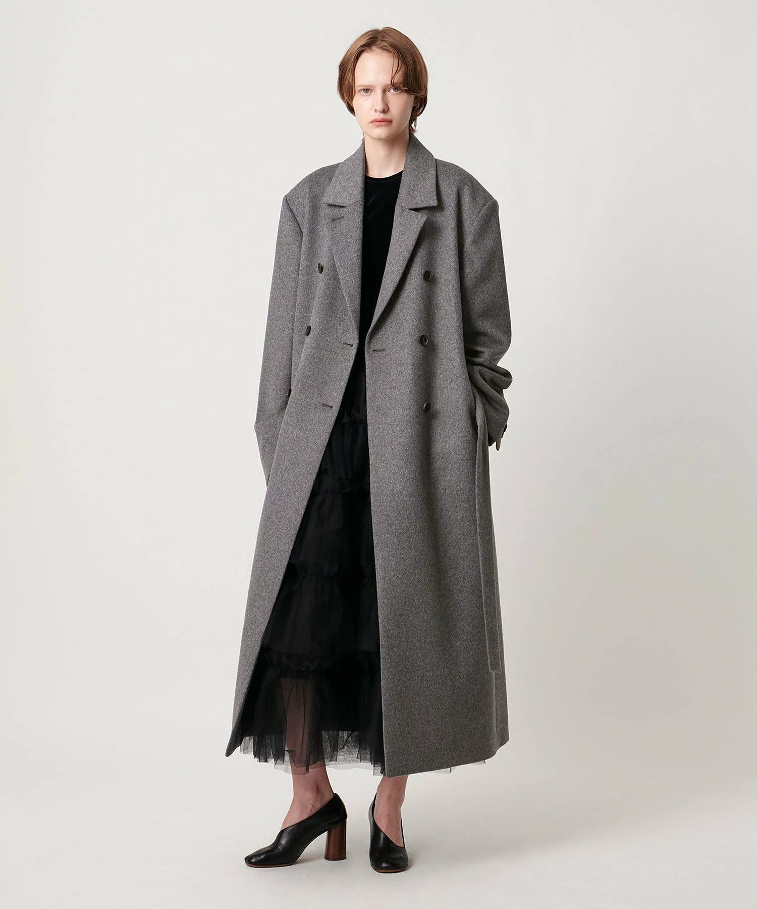 素材やクオリティを追求したハイエンドライン〈W〉から。ストンと落ち感のあるエレガントなIラインに仕立てながら、ダブルブレストのテーラリングによって、ハンサムなムードが共存する。上品なツヤ感のあるカシミヤブレンドのビーバー素材を採用し、着心地のよさは言わずもがな。