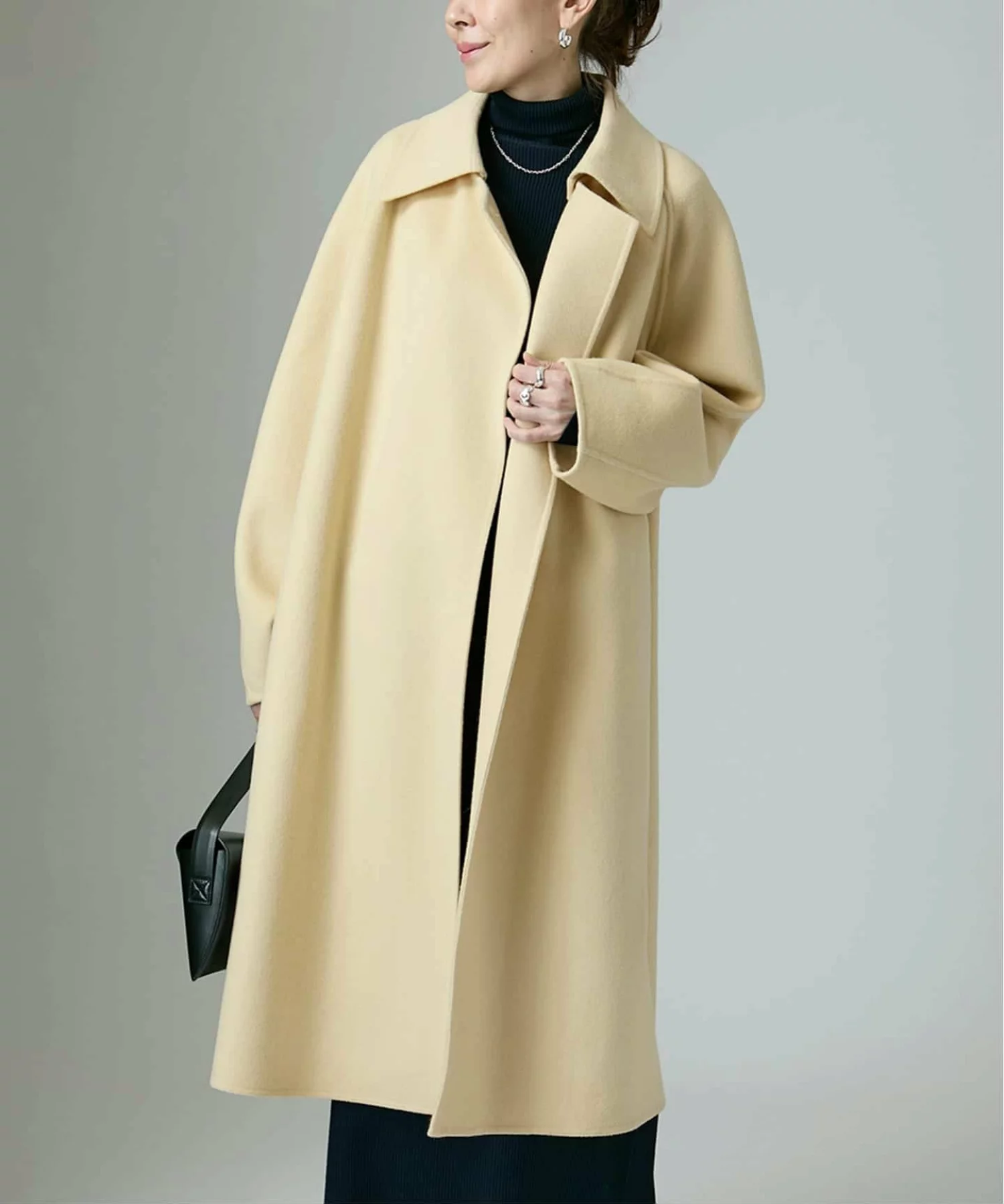 ダークトーンが増えがちな冬は、着こなしの主役になるコートで、大胆に色を取り入れるのも素敵。ボリュームのある身幅と肩を落としたリラックス感のあるシルエットには、優しげなバターイエローが好相性。取り外し可能なスタンドカラーが付属し、その日の気分でアレンジを楽しめる。