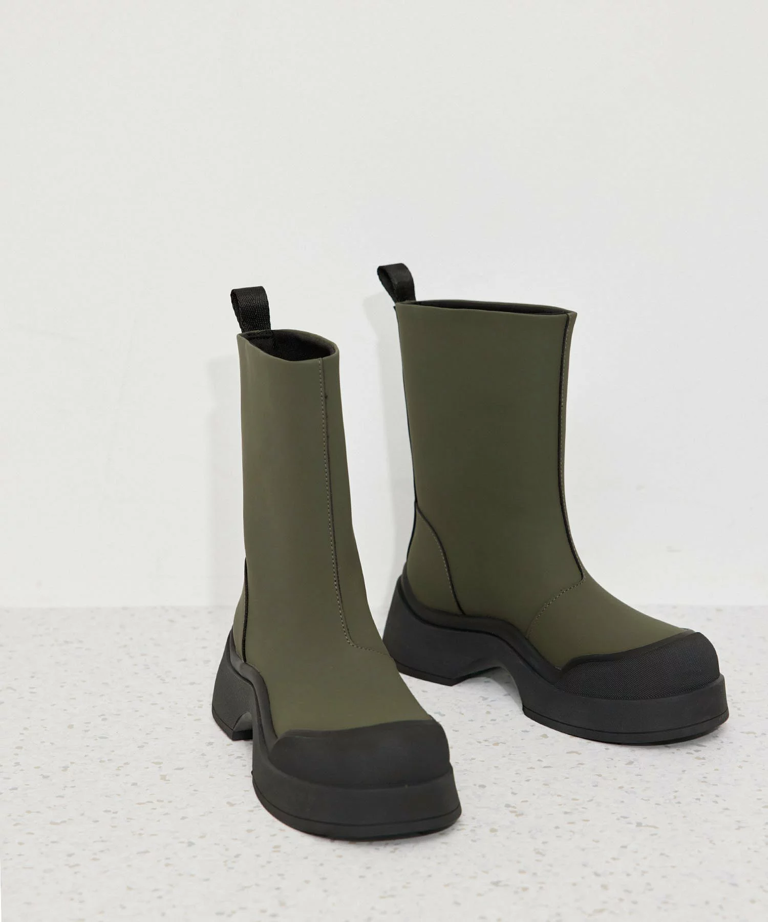 天候を問わず活躍する、レインブーツも見逃せない。アッパーにはラバー調のマットなフェイクレザーを使用。水弾きがよく、レザーとは異なる風合いが装いのアクセントに。雨の日におしゃれすることがもっと楽しくなるはず。