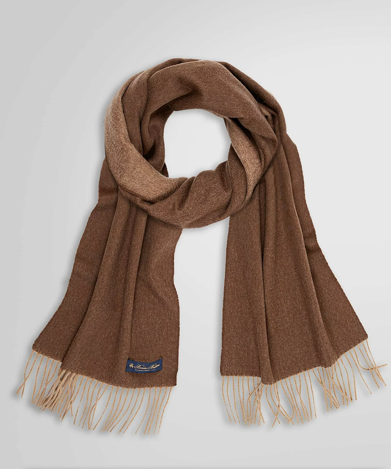 軽くて柔らかく、保温性にも優れるカシミヤを贅沢に使用したマフラー。シンプルなベーシックカラーを選べば、日常着にも通勤服にも合わせやすい。〈ブルックス ブラザーズ〉の1枚は、キャメルとブラウンのリバーシブルデザインを気分に合わせて楽しめる。