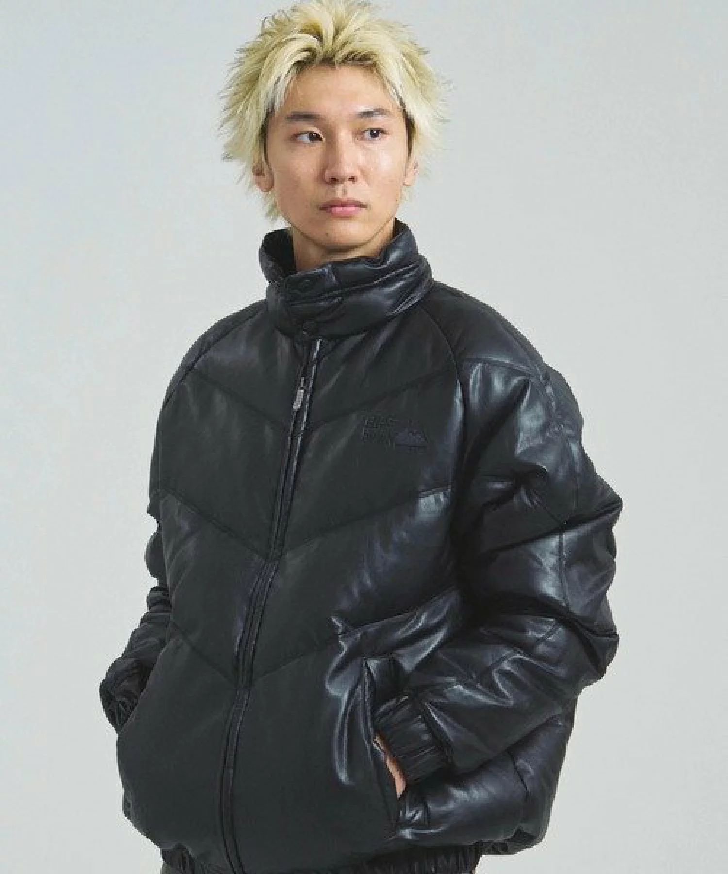 しなやかで柔らかいポリウレタンレザーを採用したダウンジャケット。光沢感のある合皮に施されたV字の切り替えデザインが、ボリュームのあるシルエットをシャープな印象に。一見すると重厚感がありながら、優れた保温性と軽い着心地を両立。カジュアルからモードなスタイルまで、装いの引き締め役としても重宝する。