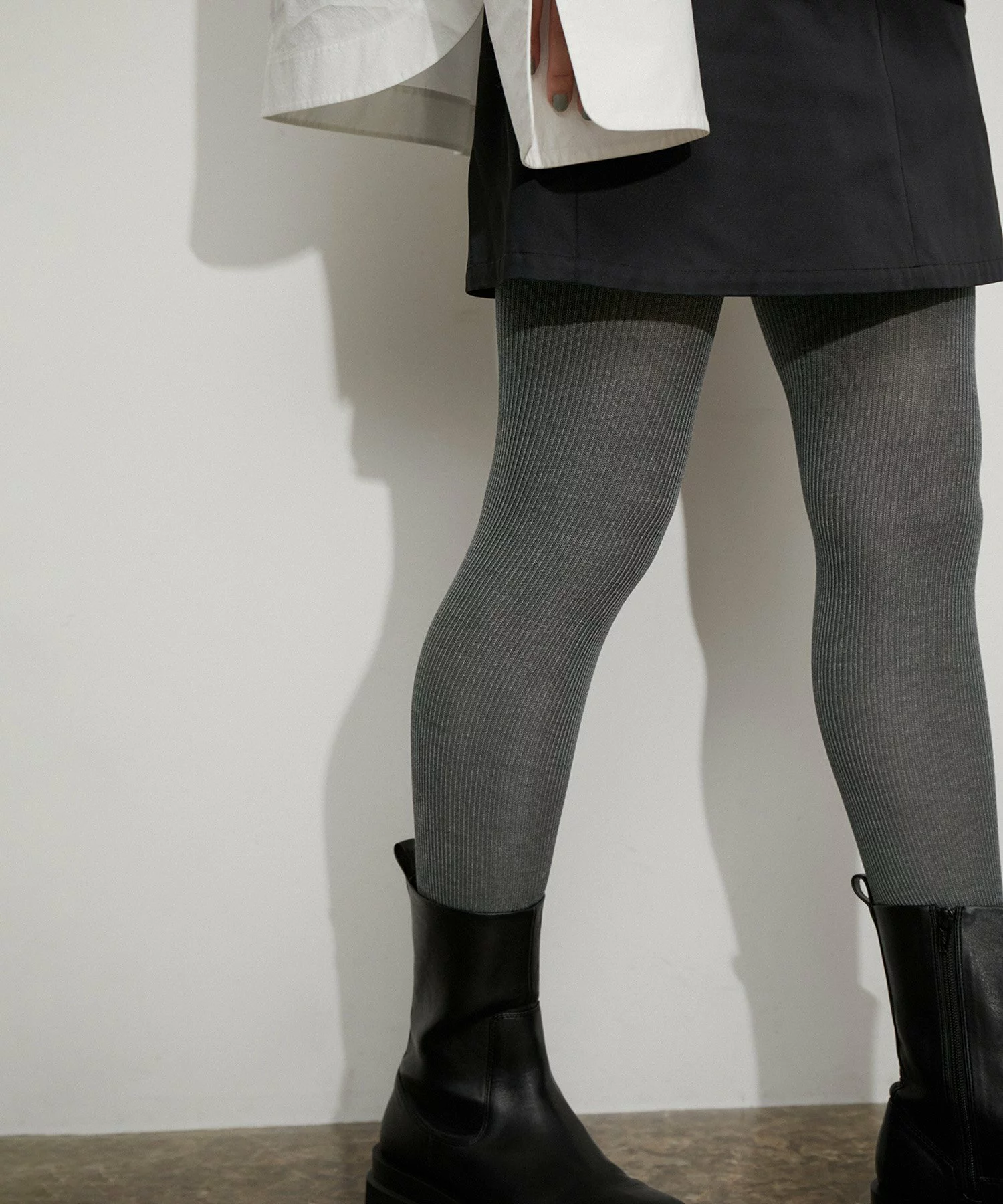 日本製の上質なシルクを100%使用。脚を冷えから守るのはもちろん、乾燥も防いでくれるため、毎日でもボトムの下に忍ばせたいマストアイテムに。やや光沢感のあるテクスチャーで、ダークカラーのシューズを合わせても軽やかな足元を演出できるのが高ポイント。