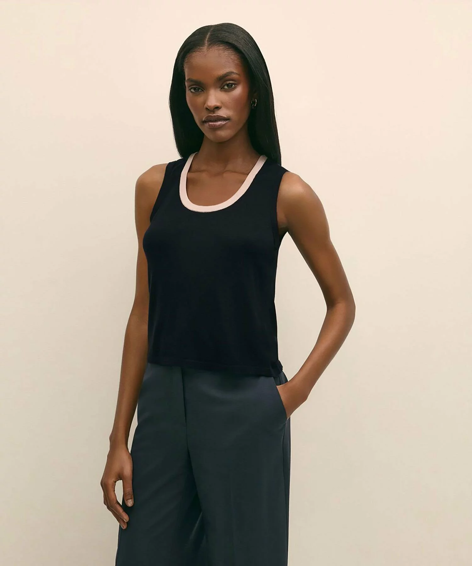 シルク混のウールで仕上げたノースリーブのセーターは、カットソーとはひと味異なるなめらかな着心地が魅力。首まわりの配色デザインによって、レイヤードスタイルをもっと楽しく。シャツの隙間からちらりと覗かせて、着こなしのアクセントに!