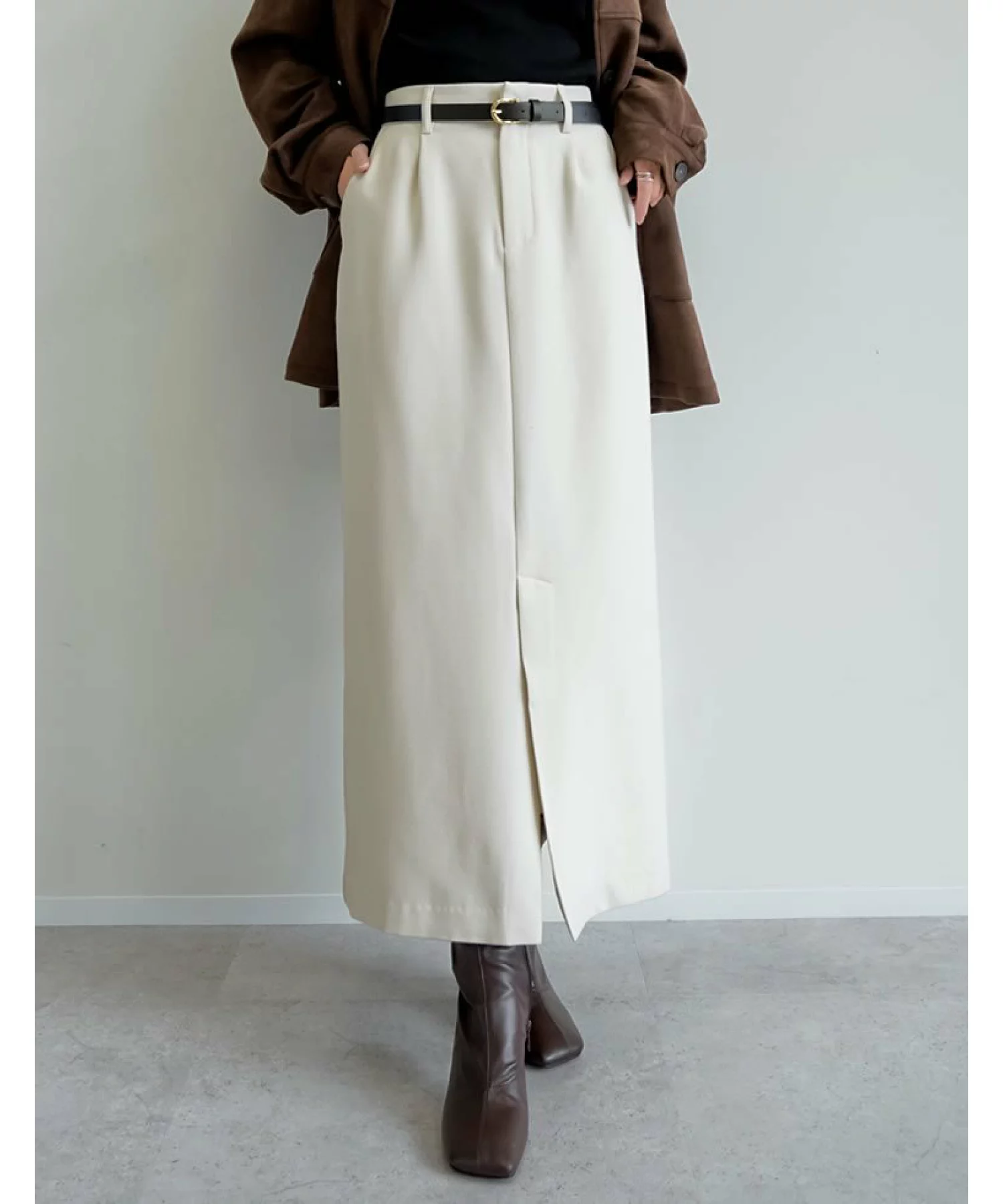ツイル素材にアルガンオイルが配合されたスカートは、チクチクした生地に悩まされている人や静電気が気になる人にもおすすめ。フロントの中心にスリットが入っているため歩きやすく、美しいIラインシルエットによりスタイルアップ効果も抜群!