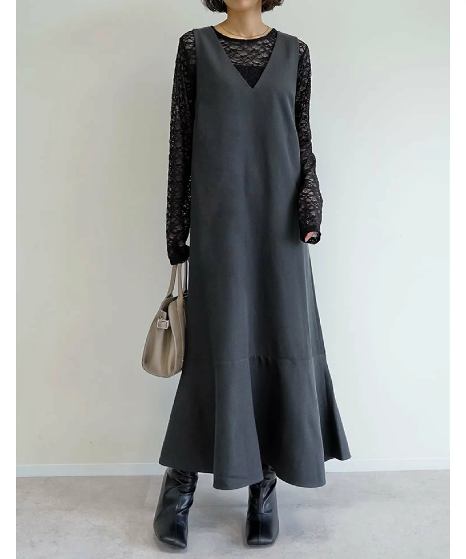 きちんと感のあるジャンパースカート。冷える季節に心地いい起毛感のあるツイル生地には、アルガンオイルを配合し、保湿力を高めた。フレアの裾はさりげなく異素材で切り替えられ、どの角度から見てもエレガント。深いVを描いた首元によって、トップスを選ばず幅広い着こなしが楽しめる。
