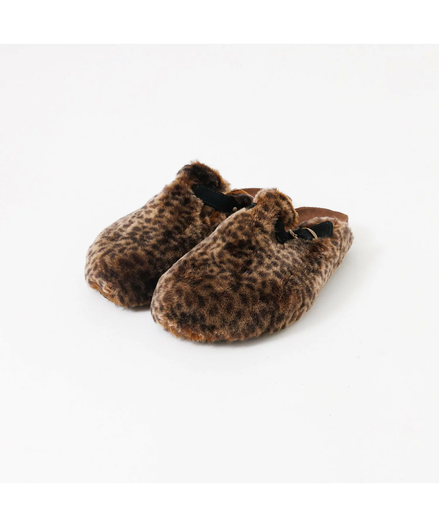 ふんわりと柔らかいムートンを使用した冬仕様のサボサンダルをチェック。ころんと丸みを帯びた愛らしいシルエットに、エッジの効いたベルトやバックルが映える。ダークトーンで仕上げたレオパード柄は、どんなコーディネートとも馴染みがよく、足元に程よいインパクトを添えてくれる。
