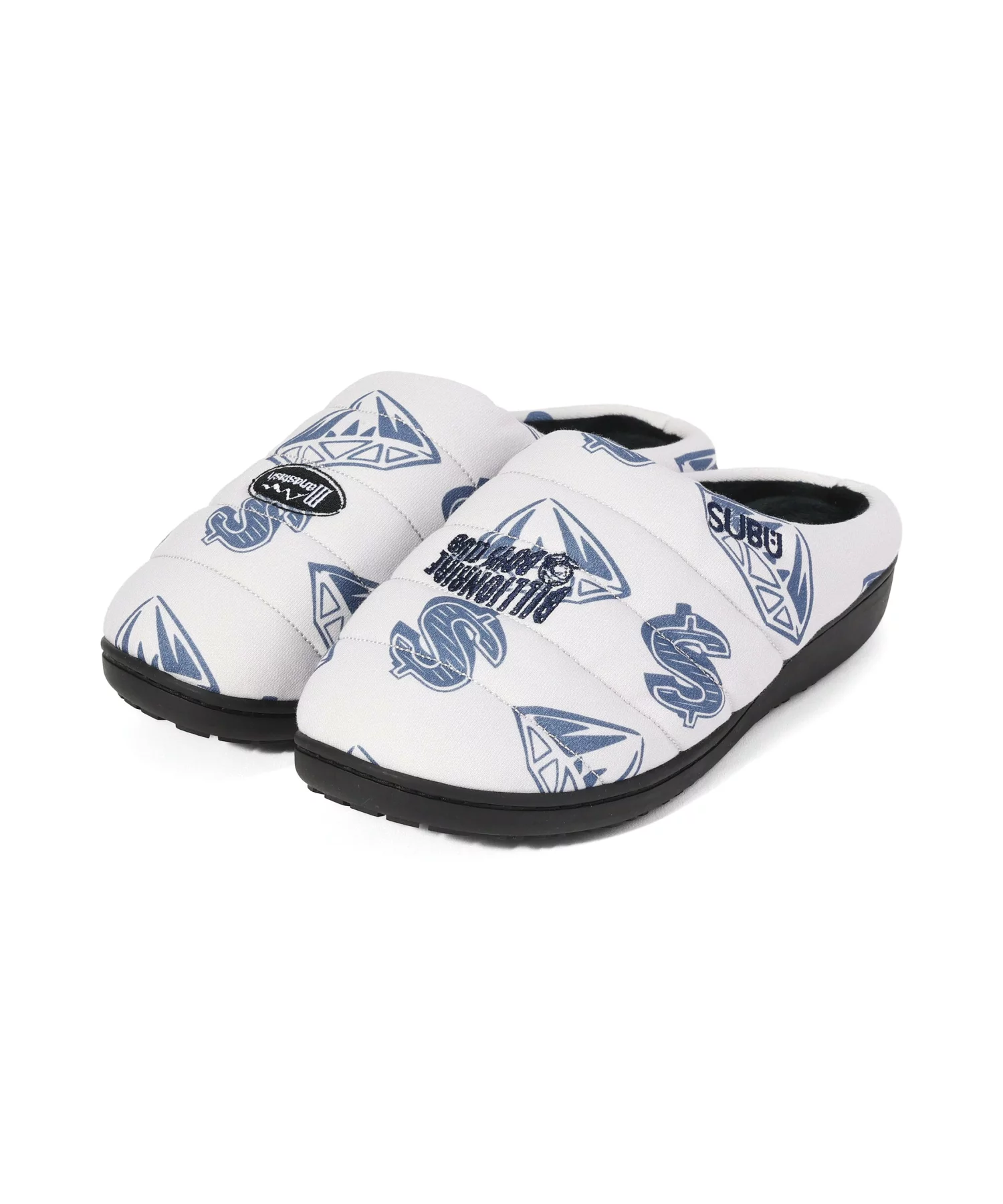 秋冬用サンダルを手がける人気ブランド〈スブ〉に、ストリートカルチャーに精通する〈ビリオネア・ボーイズ・クラブ〉が別注。後者を象徴するアイコニックな総柄を、ダウンのようにあたたかいアッパー全体にあしらった。足取りも軽快になる爽やかな白とブルーの配色が、暗くなりがちな冬の装いのアクセントに。