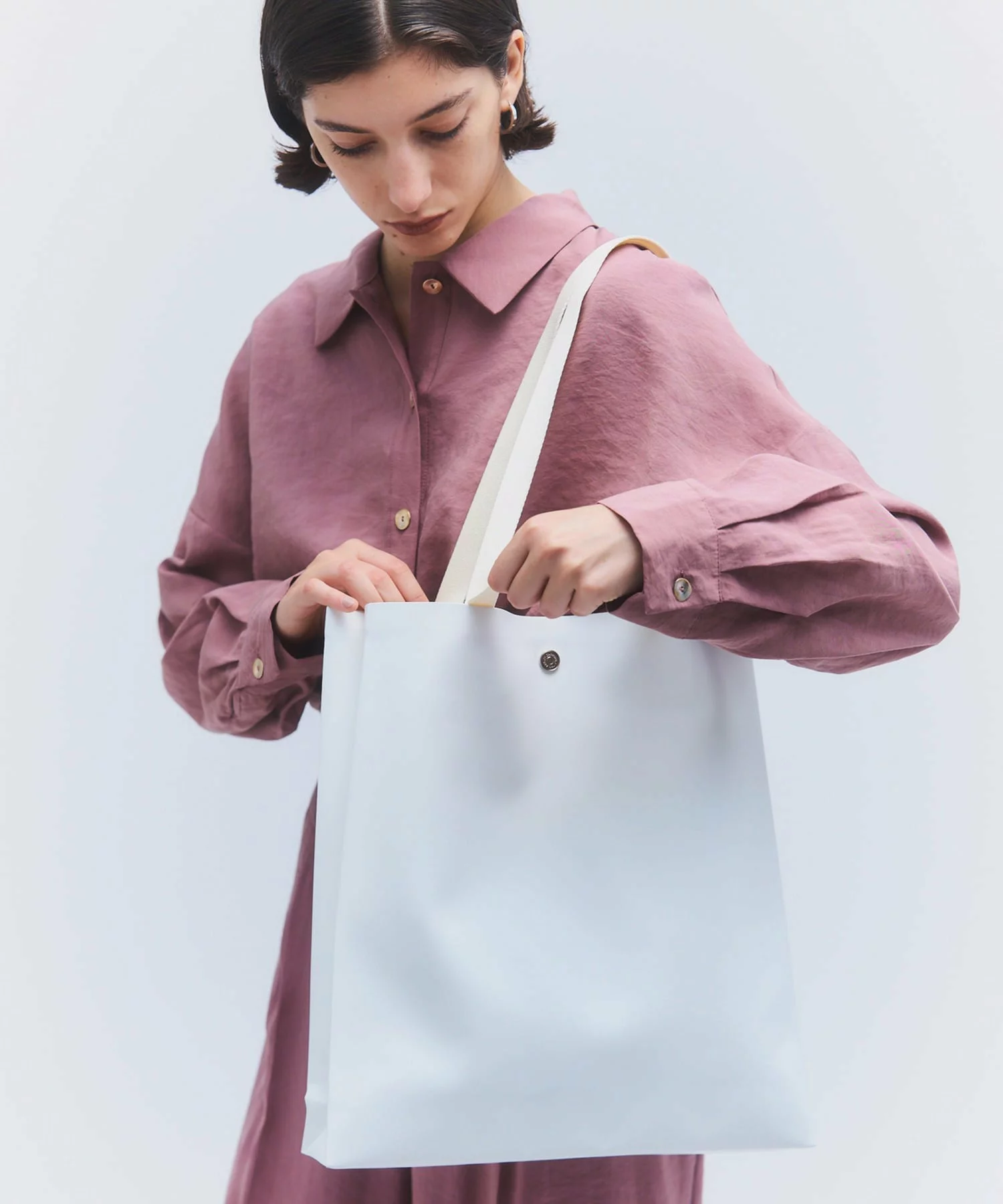 紙袋の構造から着想を得たトートバッグは、ノンステッチで仕立てることでミニマルな表情に。カーフレザーを思わせるなめらかなTPU素材を採用し、防水性と耐摩耗性も兼ね備えた。2種類の持ち手を選べる実用性と、ザクザクと荷物を入れやすい軽さが嬉しい。