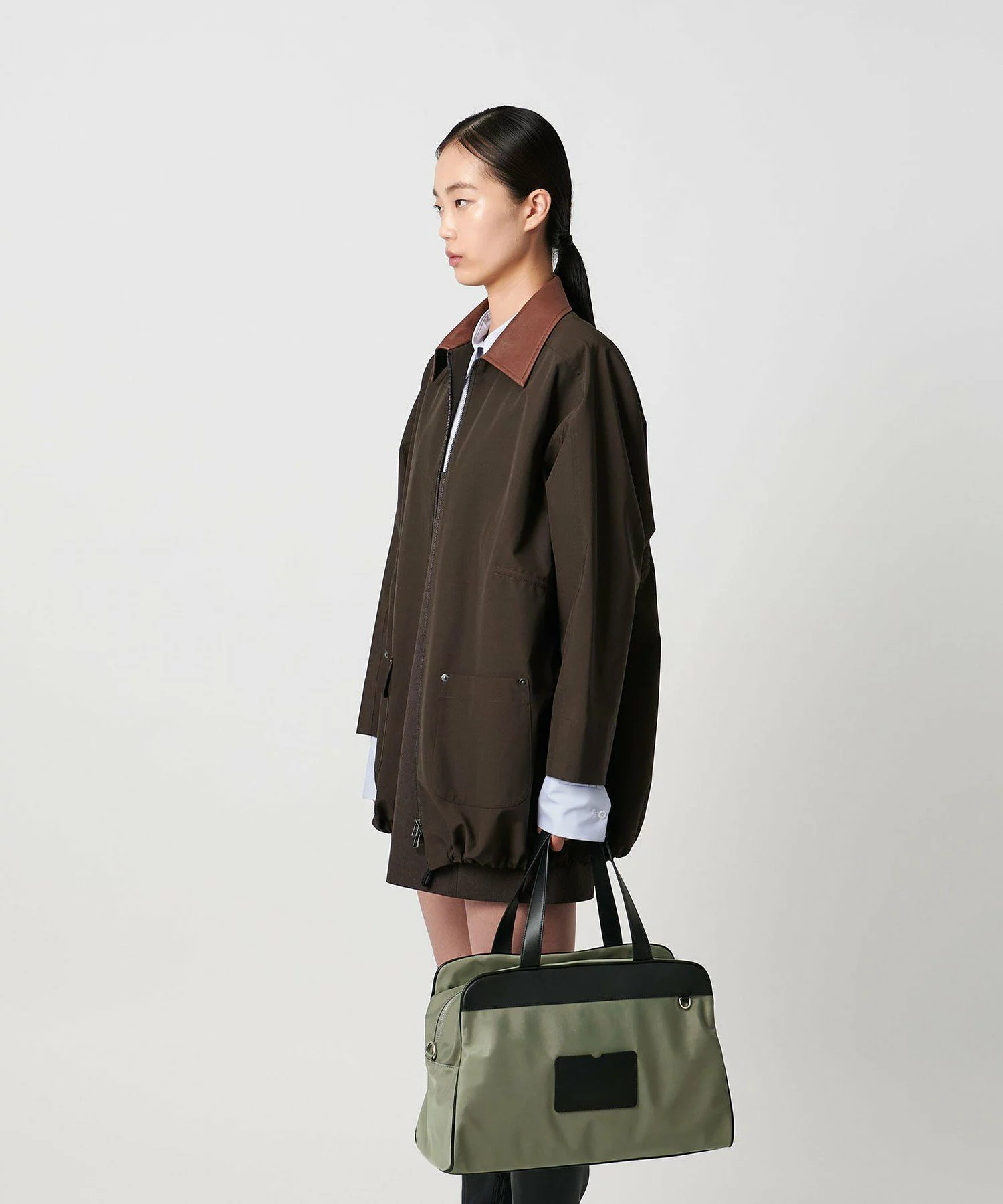 韓国発のバッグブランド〈オソイ〉のアーカイブをもとに、ユナイテッドアローズが別注。フロントに配されたカードポケットやハンドルなど、ナイロンをベースにカーフレザーで切り替えた異素材ミックスが小粋。トレンドのボストンバッグを彷彿とさせるボリューミーなシルエットは、通勤はもちろん、一泊二日の旅行バッグとしても。