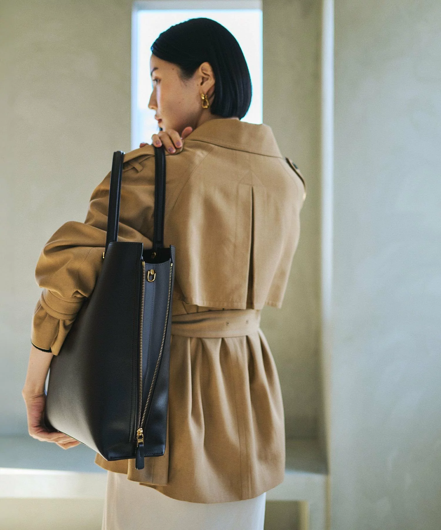 シックな黒革のバッグは、ワークスタイルはもちろん、カジュアルな着こなしにも。艶やかなビーガンレザーとベルトのディテールに配した落ち着きのあるゴールドの金具が好バランス。ファスナー付きのポケットを含む3つの内ポケットが備わり、財布やカードケースなどの必需品を効率よく収容できるのも便利。