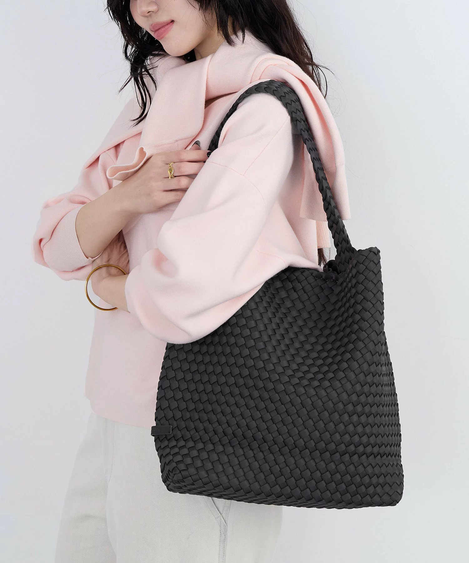 NYを拠点にするサステナブルなバッグブランド〈ナゲディ〉は、独自の製法によって軽量で汚れにくい、防水性に優れたメッシュ素材のバッグを展開。心地よく脇に収まるサイズ感でありながら、マチ幅を広く取ることでランチボックスや500mlのペットボトルもすんなり入る収納力を実現。底板を縫い付けることで、型崩れしにくく安定感のある仕上がりに。